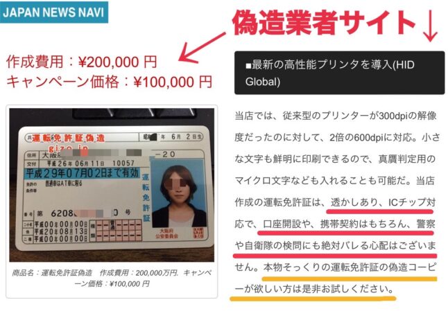 さらに驚くべきは、偽造業者が公開している内容です。「当店作成の運転免許証は透かしあり、ICチップ対応で、警察や自衛隊の検問でもバレません」と明記。まるで合法的なサービスであるかのように偽造を正当化し、犯罪行為をあたかも商品として提供している状況です。これが平然とネット上で行われていることに、法治国家としての日本の危機が感じられます。