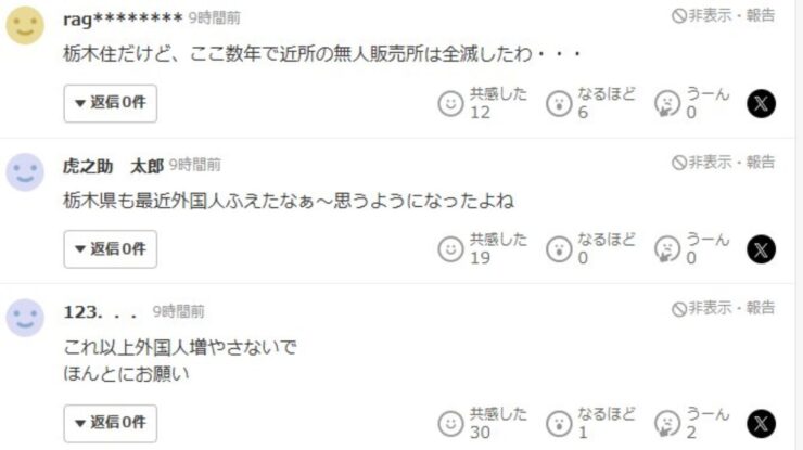 ヤフコメより抜粋を画像を添付。 「無人販売所が無くなった」は、衝撃的。