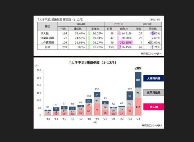 - 求人難や人件費高騰が倒産の原因として増加している。企業側も人材を確保しようと努力しているが、資金力の差がある以上、大企業と同じ待遇を提供するのは不可能に近い。