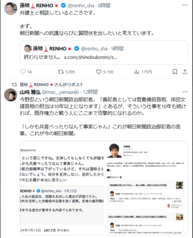 【悲報】ついに蓮舫さん、朝日新聞記者の「共産党べったり」等の単なる至極当然の批判を法的圧力等で黙らせる意思表示 そして蓮舫氏がアレな人物なのは既知だが、普段は「報道圧力が!物言えぬ空気がー」いってるリベラル界隈の人々が一緒になってこの記者を黙らせるべく荒れ狂ってるのが凄すぎる