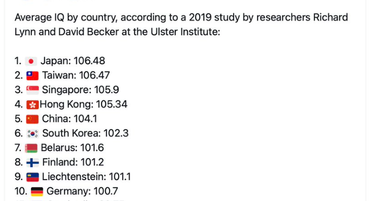世界平均IQランキング、日本は106.48で堂々の世界第一位を獲得!なのにどうして自民党に投票しちゃうの?もしかして日本の選挙はCIAやUSAIDやNEDの工作員が暗躍してる不正選挙なの?https://t.co/9GRCSqem9A…