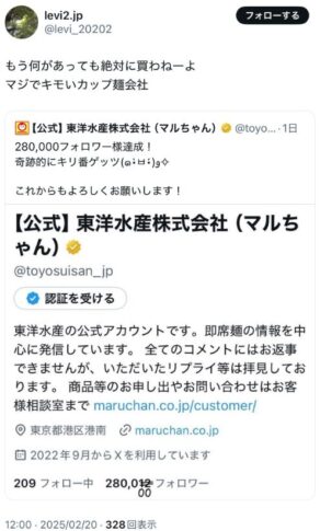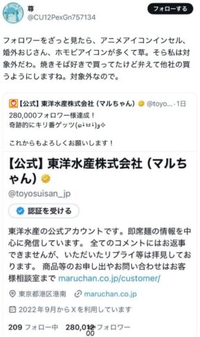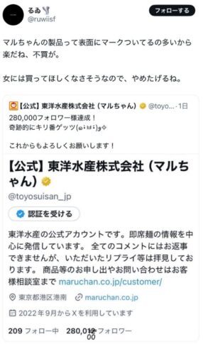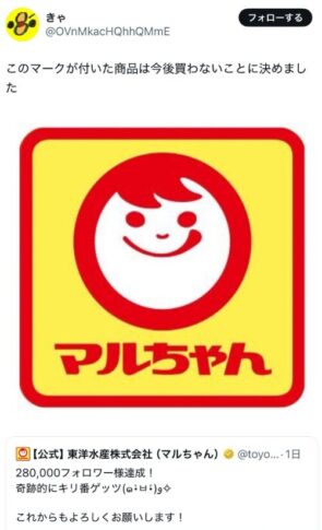 • フェミが騒いだだけで不買運動するような人は、最初からマルちゃん製品を買っていなかったんじゃないか。