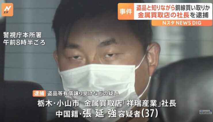 盗品の銅線ケーブルと知りながら買い取り 栃木県小山市の金属買い取り業者「祥瑞」の社長「佐藤強」こと中国籍の張 延強容疑者を逮捕 警視庁 https://t.co/8EFWqI1YNq
