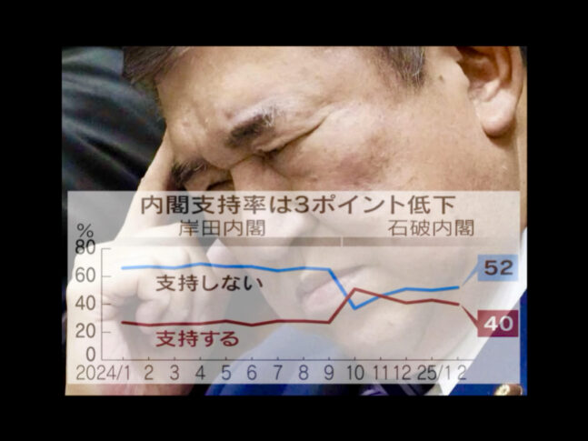 石破内閣の支持率は40%で、前回調査から3ポイント低下したが、大きな変動はなかった。「支持しない」と回答した人は52%で2ポイント上昇し、内閣に対する不満が増えていることがうかがえる。