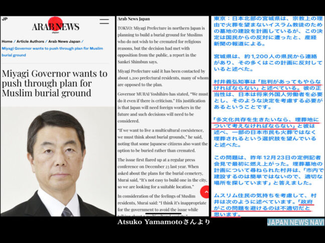宮城県民はこの人をリコールしたほうがいいよ。一度土葬墓地ができたら、そこは自分達の土地と主張するでしょう。2度と日本の土地として戻ってこないかもよ。