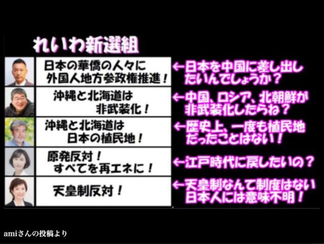 山本太郎氏の経済政策については、初期のアベノミクスと似た考え方を持っていることが多く、私自身もそこに関しては一定の共感を覚える部分があった。しかし、れいわ新選組が掲げる政策の中には、到底受け入れがたいものが多く含まれている。特に、外国人地方参政権の推進や沖縄・北海道に関する主張などは、現実を無視した非現実的なものであり、政治を語る上での基本的な視点が欠如しているように感じる。