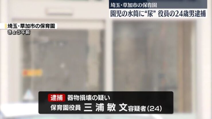 警察によりますと三浦敏文容疑者は3日、草加市の保育園で園児の水筒に尿を入れ、水筒を使えなくさせた疑いがもたれています。園児が帰宅した際、母親が水筒に黄色の液体が入っていることに気づき、警察に相談をしたということです。