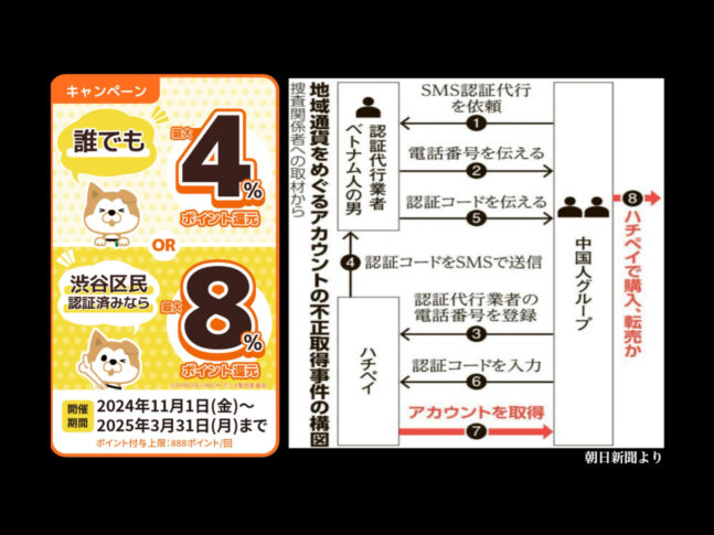 ハチペイはポイント還元率が高く、警視庁は、中国人グループが他人名義のクレジットカード情報でハチペイに入金し、不正利用していたとみている。