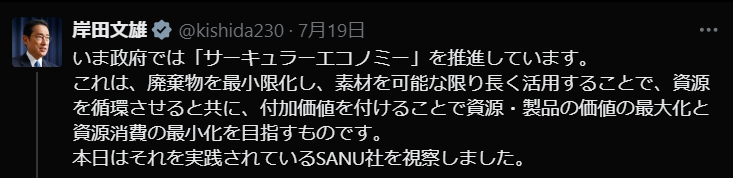 サーキュラーエコノミーの先進な取組として「SANU」を視察しました。設計段階からの徹底した廃棄物の削減、シェアリングエコノミーを通じた施設の稼働率向上などの事業モデルはその理念を体現するものです。循環経済実現に向けた関係閣僚会議を新設し、国家戦略として、政府横断的に取組を加速させます。