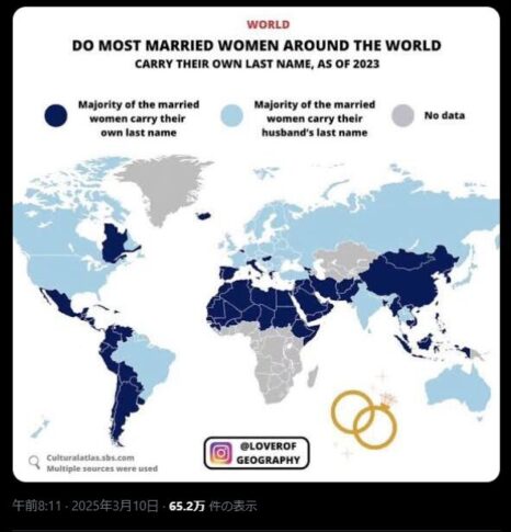 一方で、夫婦別姓が義務付けられている国々では、女性が夫の姓を名乗る自由すらないケースが多い。