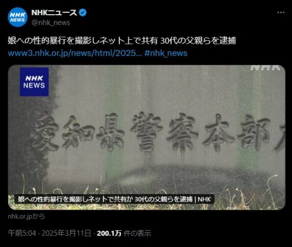 娘への性的暴行を撮影しネット上で共有 30代の父親らを逮捕https://t.co/UTctJGnmcE #nhk_news