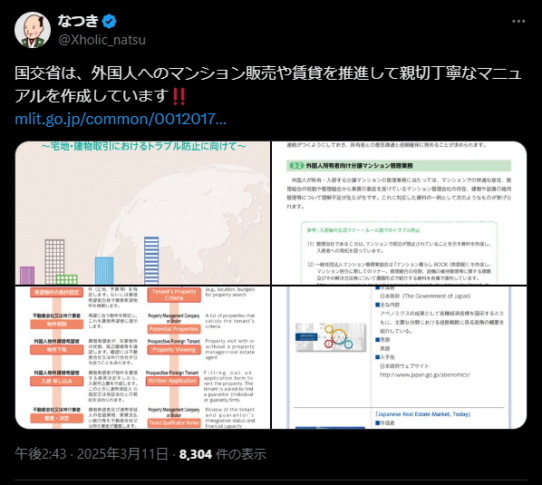 【X民】国交省は、外国人へのマンション販売や賃貸を推進して親切丁寧なマニュアルを作成しています‼️