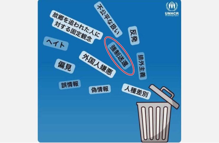 なお、国連難民高等弁務官事務所(UNHCR)の駐日事務所は、公式SNSにおいて、日本政府が実施している「強制送還」に反対する趣旨で、「強制送還」をゴミ箱に捨てなければならないとの旨の投稿をしていた。なお、この投稿は、後に一部修正されている。