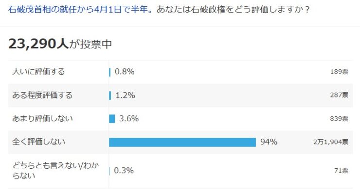 ヤフーニュース「みんなの意見」で行われた石破政権に関する世論調査の結果を見て、非常に印象的だったのは、その圧倒的な数字です。石破茂首相の就任から半年という節目に実施されたこの調査において、「石破政権を評価しない」という回答が実に97%に達しているというのは、まさに異例の結果だと感じました。