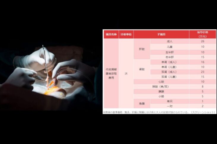 中国の一部行政機関が、臓器の取得にかかる「基準価格表」を公表したとの報道を目にし、私は背筋が凍るような思いを抱きました。この一覧表には、肝臓や腎臓、心臓、角膜といった臓器の種類別に価格が記載されており、大人と子供の区別すら設けられています。こうした情報が行政主導で「価格表」として発表されているという現実に、私は深い不安を覚えざるを得ません。