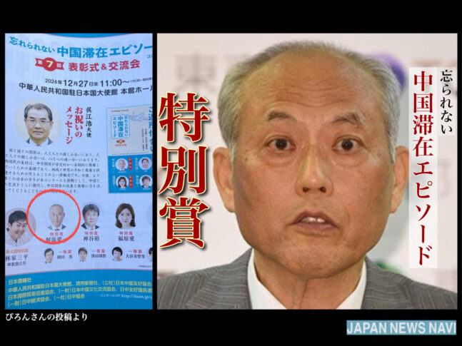 2024年12月、中国大使館主催による「忘れられない中国滞在エピソード」コンクールが開催され、元東京都知事の舛添要一氏が「特別賞」を受賞していたことが明らかになった。このイベントは、日本における中国との交流促進を目的として開催されたもので、第7回目となる今回は、都内の中国大使館本館ホールで表彰式と交流会が開かれた。