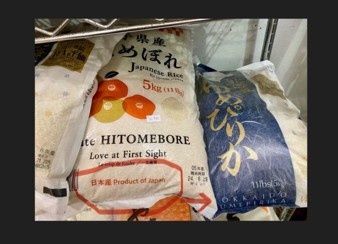 2025年4月現在、米国在住の方から送られてきた1枚の写真を見て、私は驚きと違和感を覚えました。そこには、日本産の「ひとめぼれ」(岩手県産)や「ゆめぴりか」(北海道産)が、アメリカのスーパーにずらりと並ぶ様子が写っていました。袋には「Product of Japan」の文字が明記されており、誰が見ても「正真正銘の日本産米」とわかるものです。
