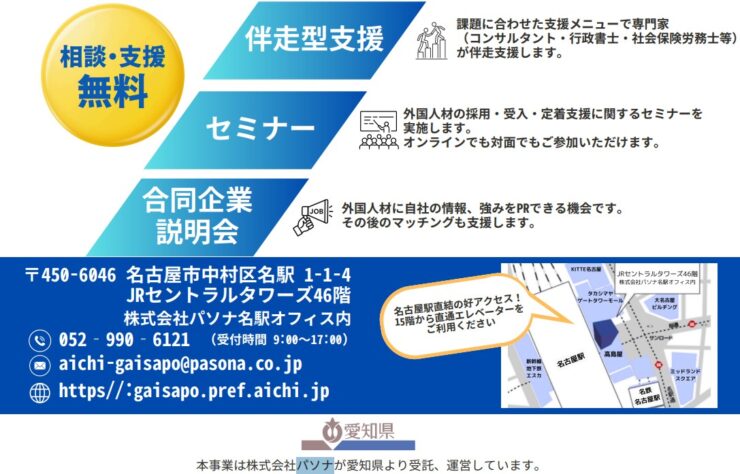 「あいち外国人材受入サポートセンター」の所在地は、JRセントラルタワーズ 46階の株式会社パソナ 「パソナ・名駅」内となる。この事業は、パソナに運営委託されている。