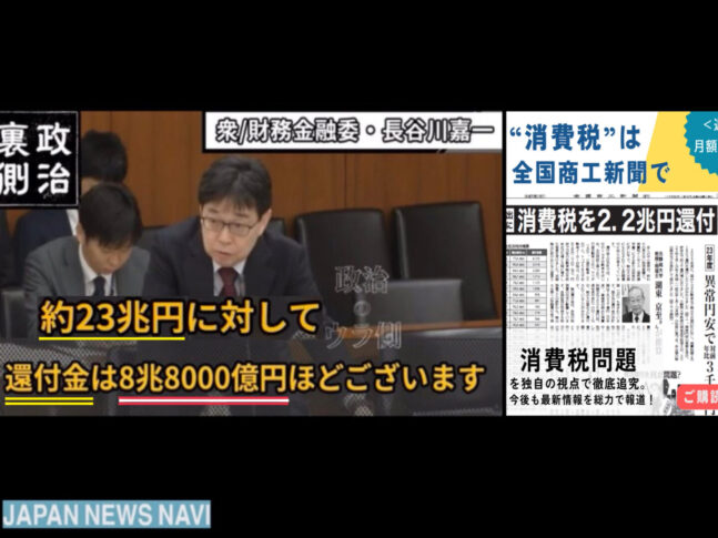 2025年3月、衆議院財務金融委員会において、立憲民主党の長谷川嘉一議員が「消費税収と輸出還付金の関係」について質問を行ったところ、財務省の主税局長が「消費税収は約23兆円、輸出還付金は8.8兆円」との数値を口にし、ネット上で注目が集まりました。