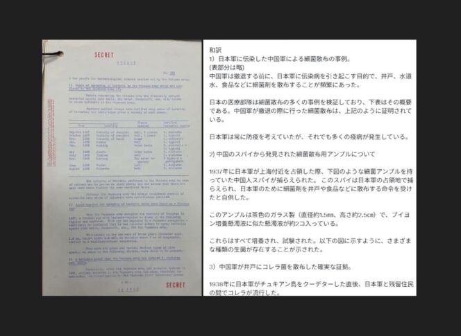 ある日、SNS上で戦時中の英国軍文書とされる画像を目にしました。そこには、日本軍に対して細菌を散布した事例として中国軍の行為を報告している英文資料と、それを翻訳した内容が並んでいました。文書は「SECRET(機密)」と記され、日付は1937年から1938年にかけてのもの。表記は英語で、複数の地名と感染症名が並び、具体的な地点と散布の手段が記録されています。