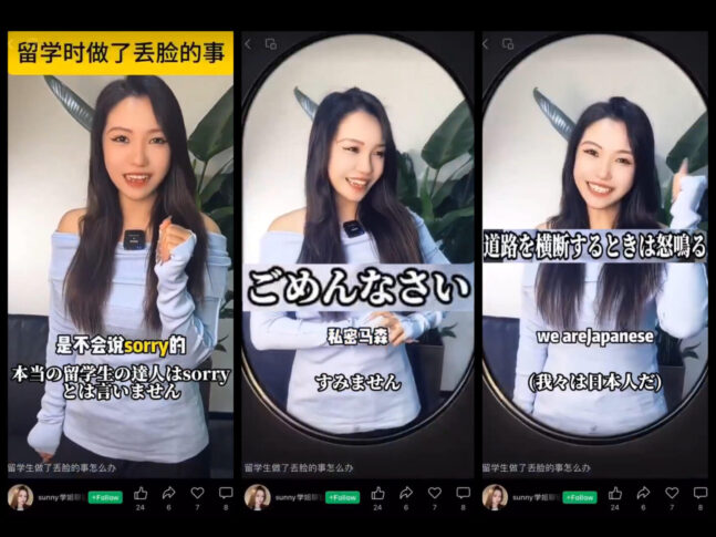 中国女子「英語の国で恥ずかしい事をしたら、日本語で謝罪する『すみません』『ごめんなさい』道路を横断する時は怒鳴る『we are Japanese(我々は日本人だ)』」とSNSで発信pic.twitter.com/Kw64e1Mbdr
