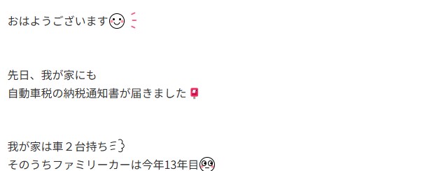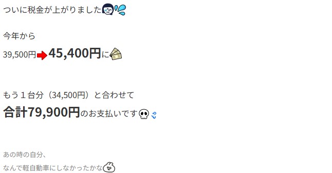 彼女の家庭では車を2台所有しており、そのうちの1台は13年目のファミリーカー。年数が経過した車には重課税が課される仕組みがあるため、これまで39,500円だった税額が、今年から45,400円に上がっていたそうです。もう1台分の税額(34,500円)と合わせると、合計で79,900円の支出になります。