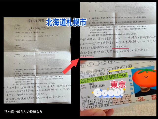 特に、札幌のあるホテルが発行した「滞在証明書」による対応は、明確に「これは住民登録には使えません」という記述がなされており、責任ある対応をしていると思いました。しかし、その隣に掲載されていた免許証には、しっかりと「ホテル名」の記載があるのです。これが現実なのかと、正直唖然としました。