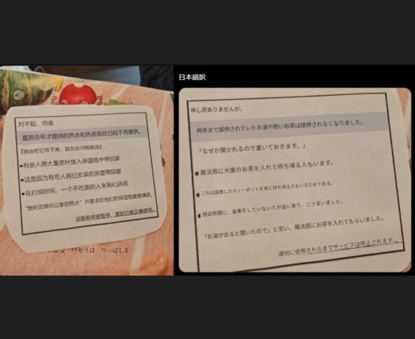 日本のレストラン、中国簡体字で「お湯とお茶の提供中止」…理由「お茶の葉を大量に魔法瓶に入れて持ち帰る人がいる」「ティーポットを家に持ち帰る人がいる」「閉店時間に食事をしていない人がお湯とお茶を魔法瓶に入れに来る」 pic.twitter.com/Nx1is4nHip