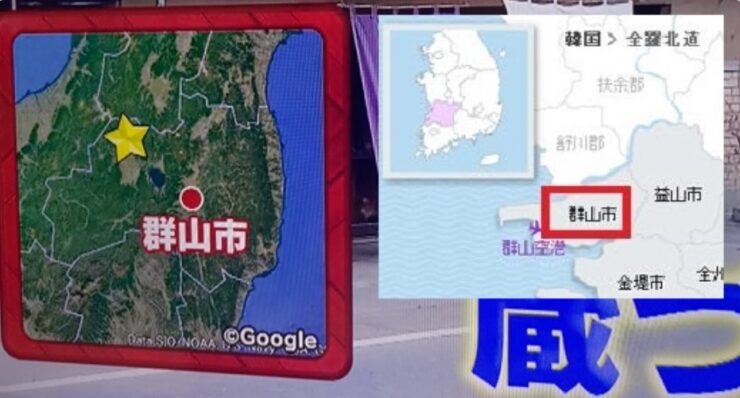 • 大韓民国全羅北道群山市。錦江河口付近にある都市だよね。 西暦663年、中大兄皇子が派遣した日本軍が唐・新羅連合軍に大敗した白村江の戦いがあった地域。日本にとって縁起の良くない所だ。テレ朝はわざと間違えた訳ではないんだろうけど。