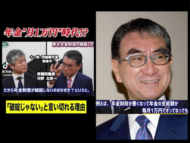 今回拝見したのは、河野太郎衆議院議員と東修平氏(前・四條畷市長)との対談の一幕でした。その中で最も印象に残ったのが、「年金支給額がたとえ月1万円になったとしても、制度として破綻ではない」という発言でした。正直に申し上げて、私は耳を疑いました。