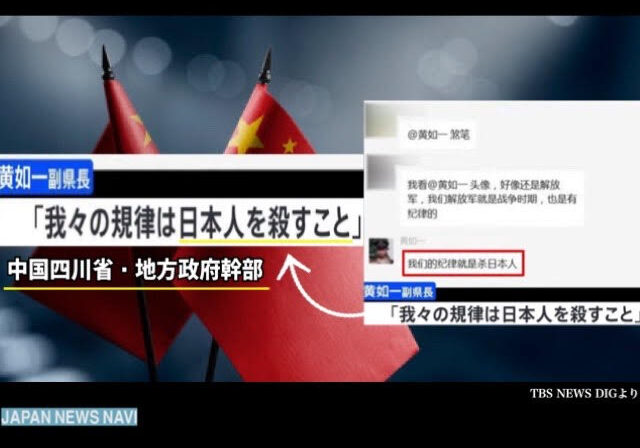 「我々の規律は日本人を殺すこと」中国の地方政府幹部がSNS上に書き込みか