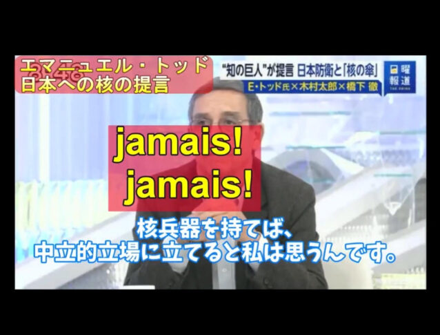 エマニュエル・トッド氏が日本への核の提言を言おうとしたところで、話しは遮られ、番組は突然終了した。日本は「核を持たず、作らず、持ち込ませず」だけではなく、『言わせない、考えさせない、議論もさせない』という開いた口が塞がらないほど幼稚で呆れた考えや報道がまかり通る国なのです。 pic.twitter.com/HGPlIrVEH4