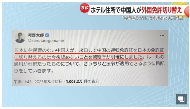 【X民】河野太郎氏の運転免許切り替え規制の投稿はウソ。しかしFNNは「中国人差別」と報道。ウソに慌てて必死に中国擁護する姿、まるで中国の部下