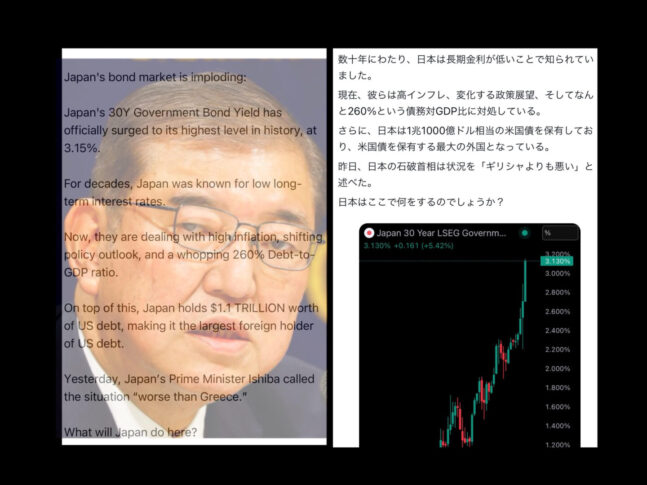「日本はギリシャよりも悪い」。石破首相のこの一言が、今まさに日本の金融市場を揺るがしています。国債利回りは3.15%を超え、債券市場では「崩壊が始まった」とも報じられています。海外メディアが一斉にこの発言を取り上げたことで、日本経済の信頼性に深刻な影響が及んでいます。