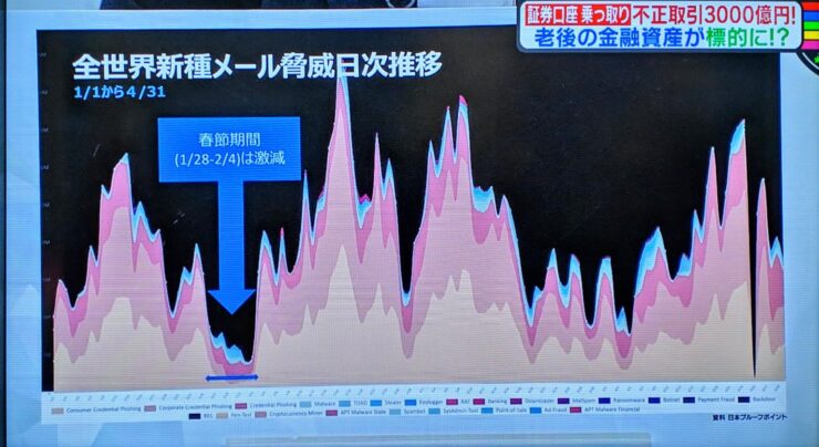 先日、テレビの報道番組で「全世界新種メール脅威日次推移」のグラフが紹介されていたのを目にし、非常に興味深いと感じました。特に私の目を引いたのは、1月28日から2月4日頃の間、スパムメールやフィッシングなどのサイバー攻撃が急激に減少しているというデータでした。その期間は「春節(旧正月)」にあたるとのことで、要するにスパムメールを仕掛ける側も“正月休み”を取っているのではないかと示唆されていたのです。