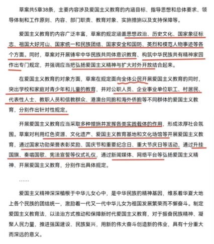 愛国主義教育の内容は非常に幅広く、草案の規定は政治思想、歴史文化、国家の象徴と標識、祖国の美しい河川山岳、国家統一と民族団結、国家安全と国防、英雄模範人物の事績などをカバーしています。