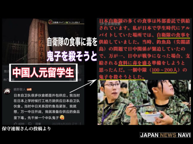 今回、改めて日本の安全保障の脆弱さを突きつける出来事が明らかになりました。元中国人留学生がSNS上で「自衛隊に食事を納入するアルバイトをしていた。もし日中が戦争になれば、食事に毒を盛るつもりだった」と告白したのです。この投稿には自衛隊信太山駐屯地の画像も添えられており、その生々しさに多くの国民が驚愕しました。