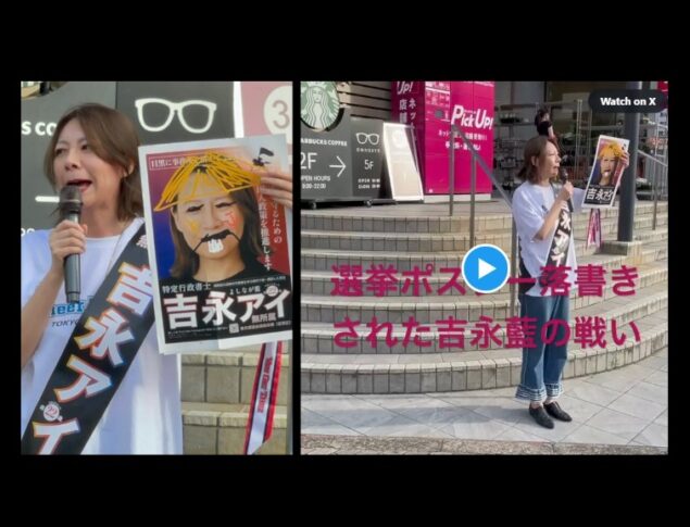 今回の件に触れ、私は「ここまで政治の表現空間が乱されているのか」と驚きを禁じ得ませんでした。目黒区から都議選に立候補している吉永アイ氏の選挙ポスターに落書きがされ、それがSNSで拡散されると同時に、候補者本人が涙ながらにそのポスターを掲げ訴える場面が投稿されました。