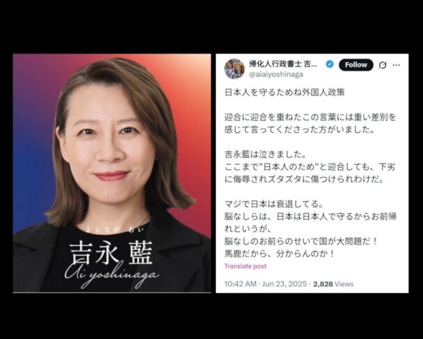 私は今回、目黒区から都議選に立候補し、落選となった吉永藍氏のSNS投稿を見て、正直なところ強い違和感と疑問を抱かざるを得ませんでした。とくに、「日本人を守るためね外国人政策」「日本人に全ての責任がある」といった言葉の選び方や論調には、公人としての冷静さや慎重さが感じられず、感情論のままに主張が展開されている印象を受けました。