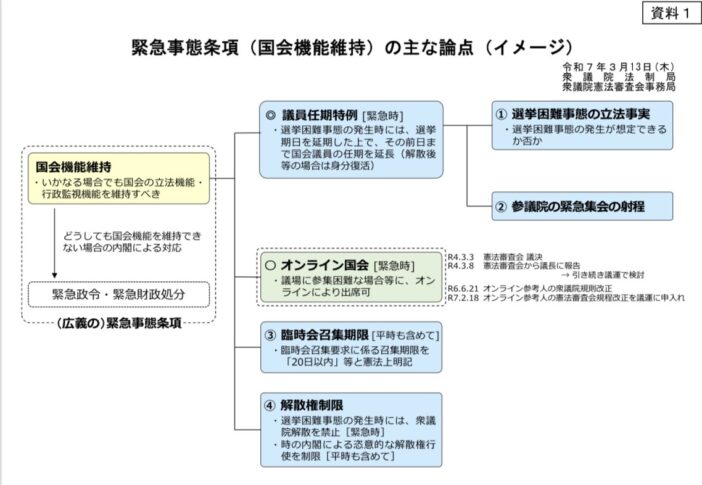 令和7年3月13日に作成された衆議院憲法審査会の資料では、はっきりと「緊急事態条項(国会機能維持)」というタイトルが付けられており、名称が併記されていることが確認できる。しかも、図中の左側には「国会機能維持」として「いかなる場合でも国会の立法機能・行政監視機能を維持すべき」と記述がある一方で、その下には「広義の緊急事態条項」と小さく添えられている。