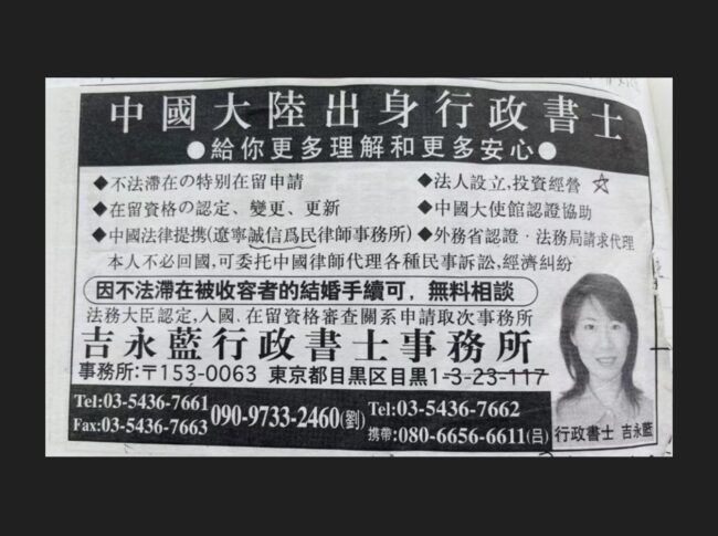 私は先日、SNSでとある投稿に目が留まりました。そこには「中国大陸出身行政書士」と自ら名乗る人物が堂々と紙面広告に登場し、不法滞在者の結婚手続きや、外国人向けの在留資格更新、法人設立支援などを大々的に謳っていたのです。しかもこの人物は、吉永藍という名で、先の東京都議会議員選挙に出馬し落選。さらに、来月7月には参議院議員選挙への出馬も予定しているという事実を知って、私は言葉を失いました。