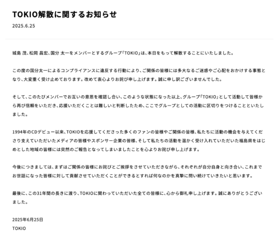 国分太一のコンプライアンス違反を改めて謝罪し「皆様から再び信頼をいただき、応援いただくことは難しいと判断した」と報告。「31年間の長きに渡り、TOKIOに関わっていただいた全ての皆様に、心から御礼申し上げます」と結んだ。 pic.twitter.com/FTiBmxAwKU