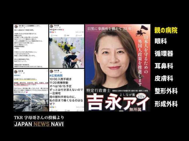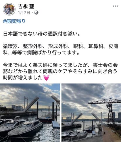 - 吉永藍は、自分の両親を日本に呼び寄せ、医療保険のサービスを受けさせている。