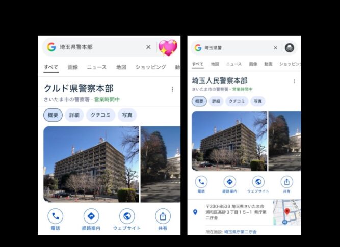 私は、Xで見かけたこの投稿を最初に目にしたとき、目を疑いました。「埼玉県警本部」で検索すると「クルド県警察本部」と表示される。まるでフィクションのような画像が、本物のGoogle検索結果として表示されていたという事実に、正直言って強い衝撃を受けました。
