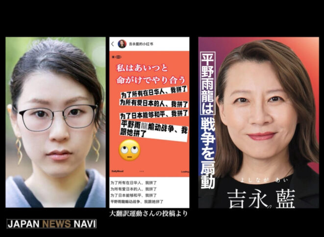 今回、吉永アイ氏が執拗に名指しして攻撃している平野雨龍氏は、保守的な視点から見れば賛否あるにせよ、少なくとも日本のために活動している政治家として一定の評価を受けています。にもかかわらず、吉永氏はSNS上で、しかも中国語で、彼女に対して「戦争を煽っている」などと強く非難し、その姿勢に明らかに私的な敵意すらにじませています。