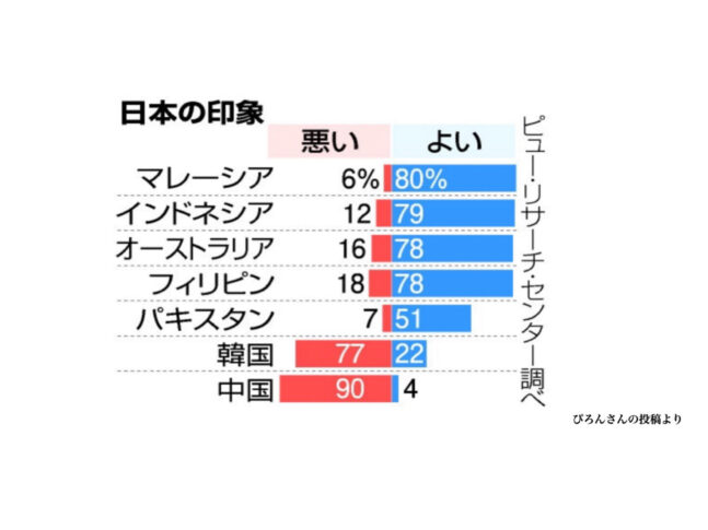 ピュー・リサーチ・センターの調査結果を見て、まず感じたのは、やはりという思いと、改めて突きつけられる現実だった。マレーシア、インドネシア、オーストラリア、フィリピンといった国々では、日本に対する「よい印象」が8割近くと非常に高い。それに対し、韓国と中国だけが極端に評価が低い。韓国では「悪い印象」が77%、中国にいたっては90%に達している。この落差が物語るものは大きい。