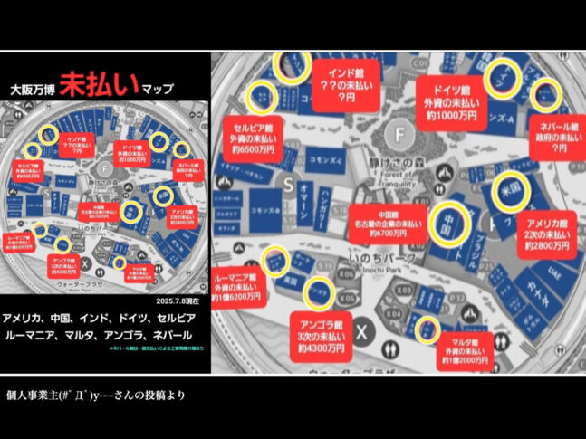 2025年に開催される大阪・関西万博に関し、個人が作成した「未払いマップ」がX(旧Twitter)上で拡散され、大きな注目を集めています。この画像には、複数の国が万博に関連した支払いを滞納している実態が地図上に記されており、なかには「未払い3次まで」「外国業者への未払い」など、額も性質もさまざまです。