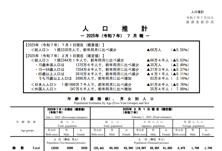 2025年7月1日現在の日本の総人口は、1億2330万人となり、前年比で68万人の減少となった。これは総務省統計局が7月22日に発表した「人口推計(令和7年7月報)」によるもので、減少率は**0.55%**と報告されている。