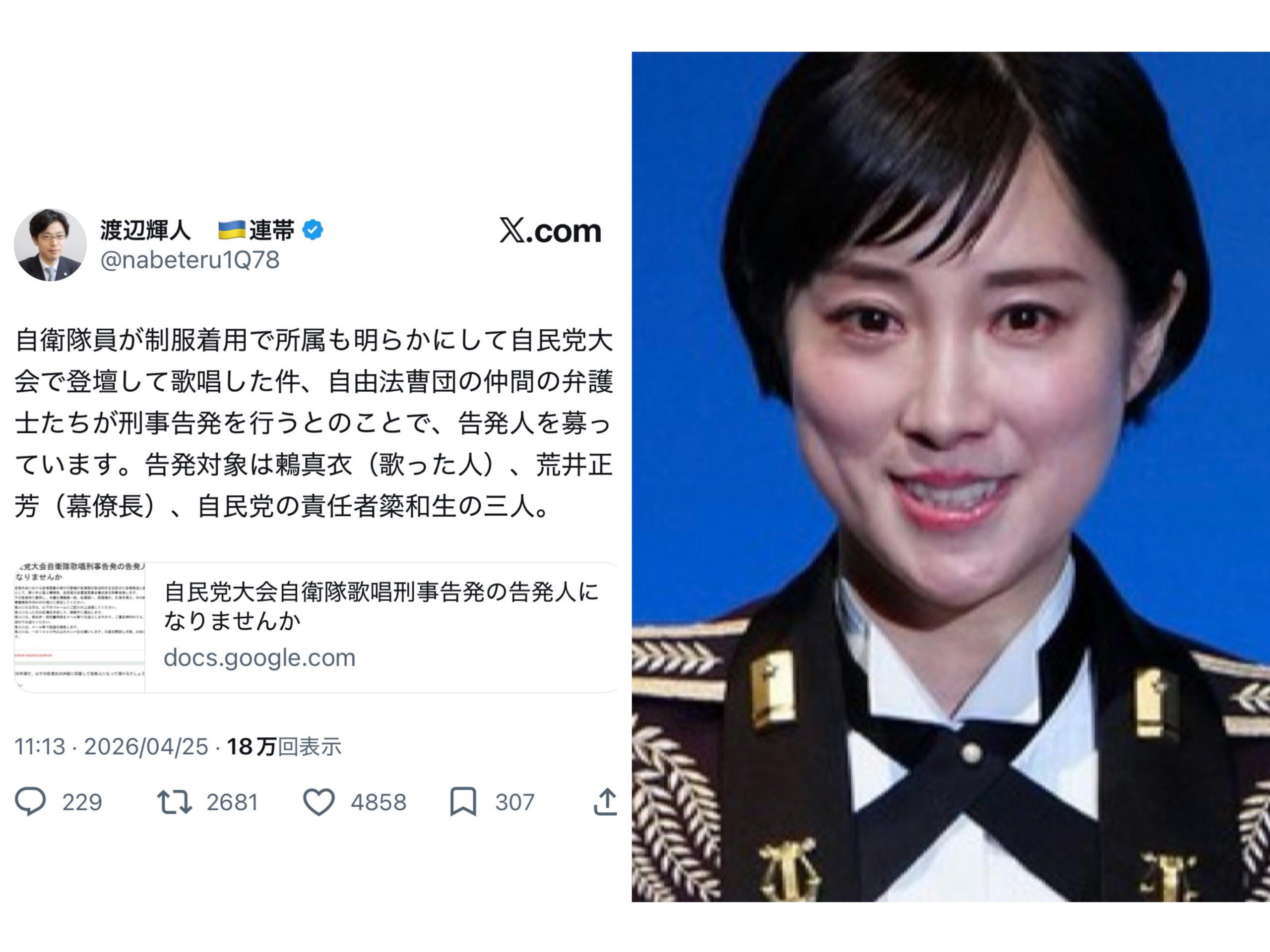 自民党大会での自衛官歌唱めぐり、弁護士らが刑事告発人を募集していると話題に[26/04]