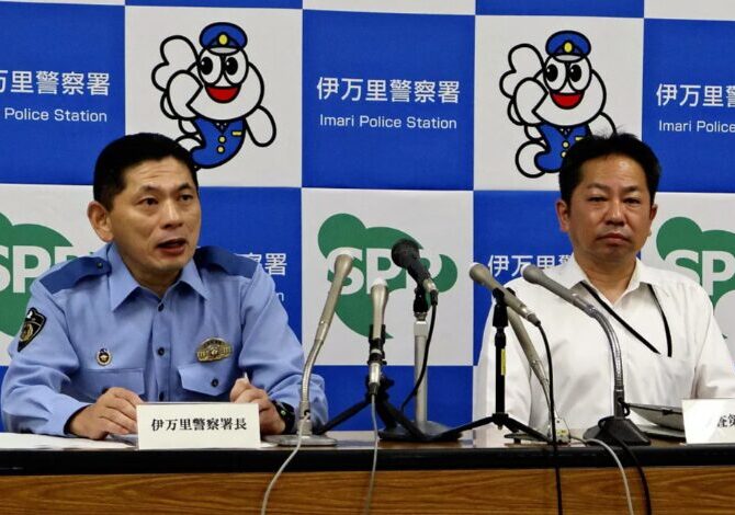 佐賀県伊万里市の民家で母娘2人が侵入してきた男に襲われて死傷した事件で、犠牲になった椋本舞子さん(40)が、日本語を教えていた中国から一時帰国中に事件に巻き込まれたことが捜査関係者らへの取材でわかった。容疑者の逮捕について記者会見で説明する平川署長(左)と今井課長
